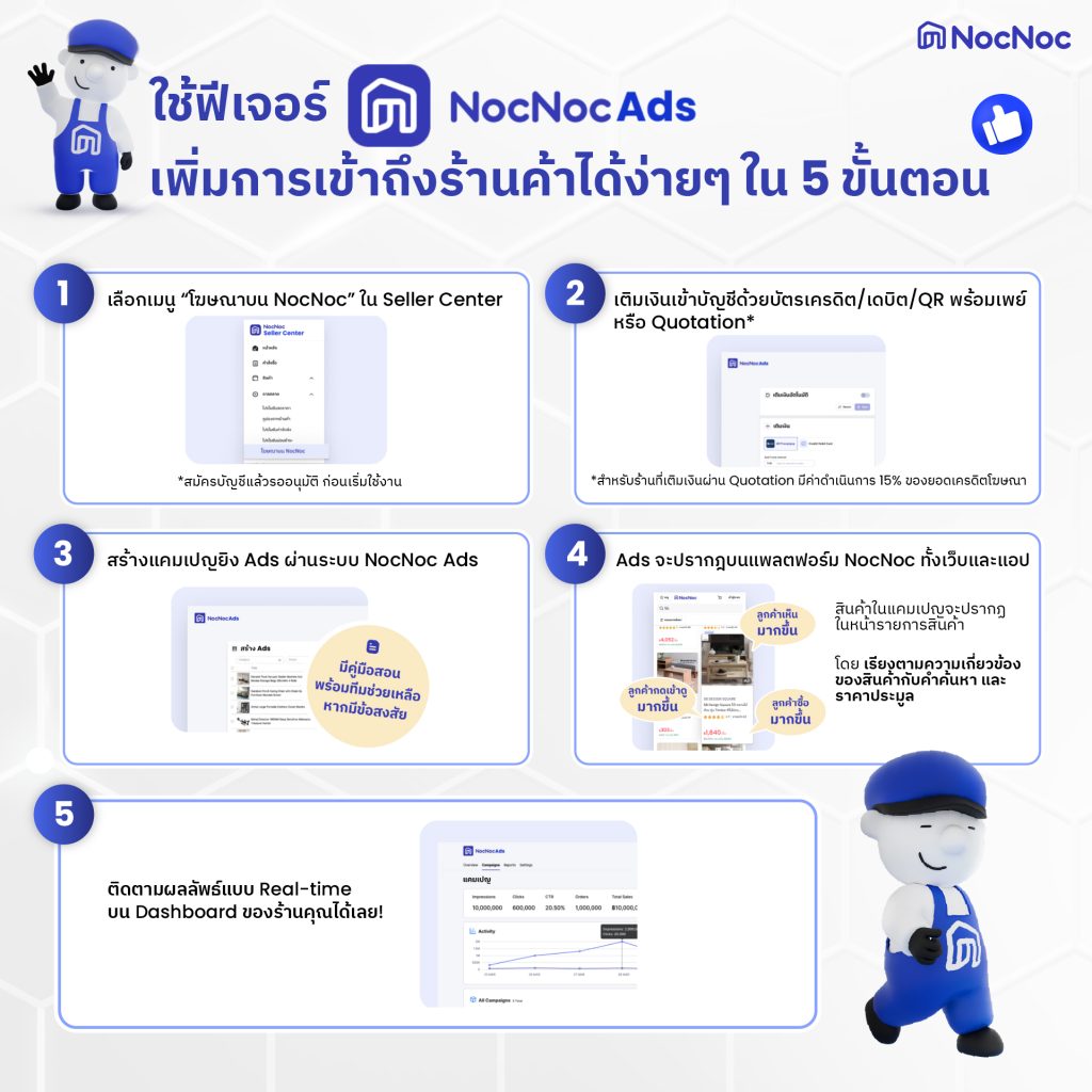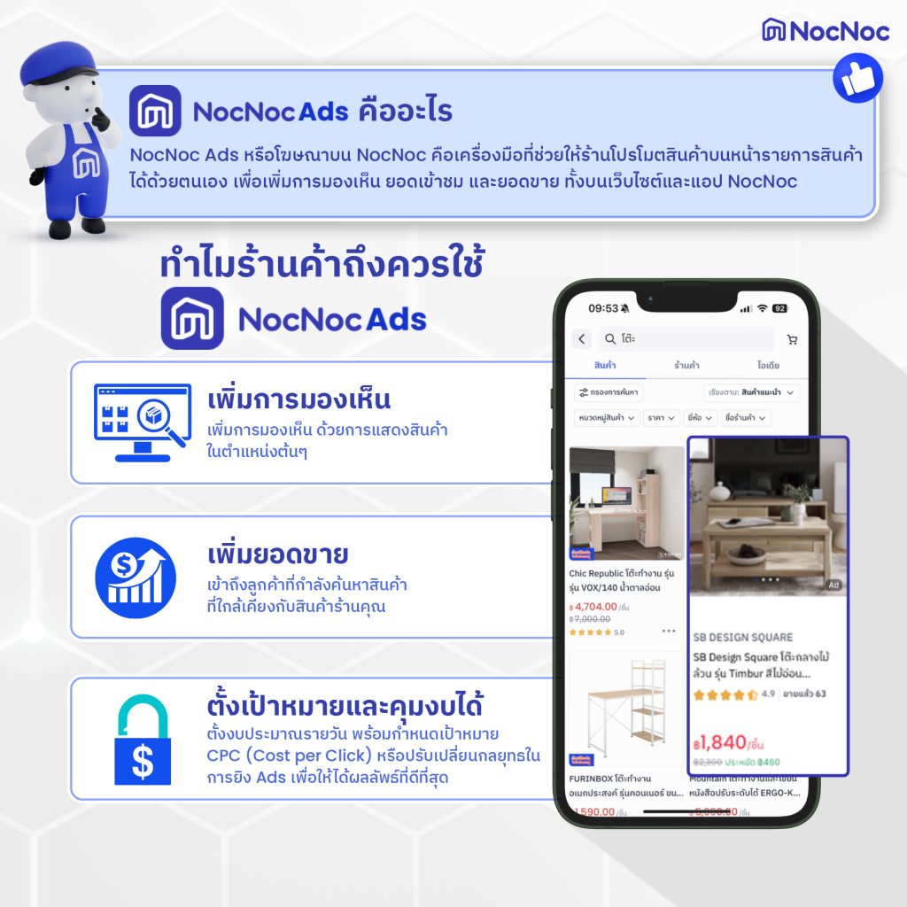 NocNoc Ads หรือโฆษณาบน NocNoc คือเครื่องมือที่ช่วยให้ร้านค้าสามารถโปรโมตสินค้าในร้านค้าของคุณบนหน้ารายการสินค้าได้ด้วยตนเองให้โดดเด่นบนแพลตฟอร์ม NocNoc ซึ่งจะทำให้ผู้ซื้อมองเห็นสินค้าของคุณได้ง่ายขึ้นและนำไปสู่ยอดขายที่เพิ่มขึ้น ทั้งบนเว็บไซต์และแอปพลิเคชั่น NocNoc โดยร้านค้าสามารถกำหนดค่าใช้จ่ายต่อคลิกได้เอง และจะเกิดค่าใช้จ่ายขึ้นต่อเมื่อมีการคลิกบนรายการสินค้าของคุณแล้วเท่านั้น