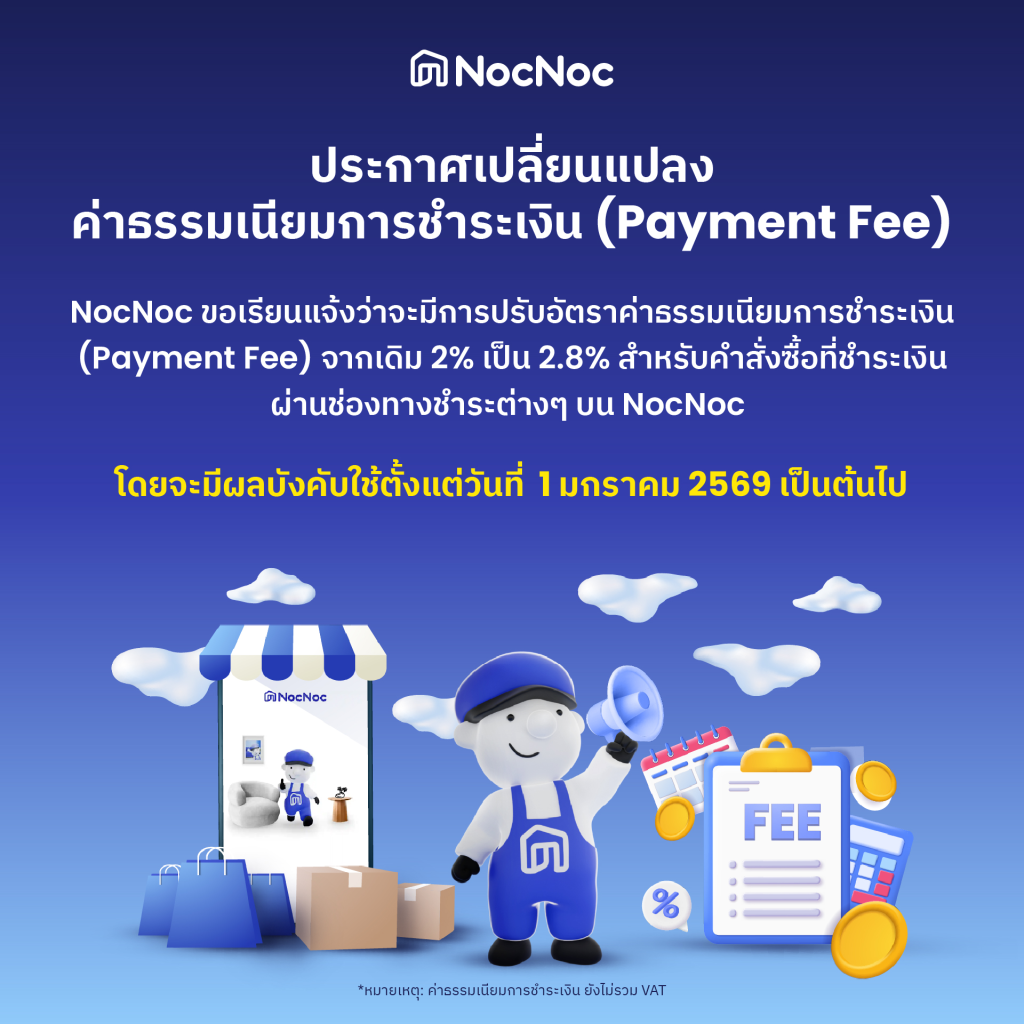 NocNoc ขอเรียนแจ้งว่าจะมีการปรับอัตราค่าธรรมเนียมการชำระเงิน (Payment Fee) จากเดิม 2% เป็น 2.8% สำหรับคำสั่งซื้อที่ชำระเงินผ่านช่องทางชำระต่างๆ บน NocNoc โดยจะมีผลบังคับใช้ตั้งแต่วันที่ 1 มกราคม 2569 เป็นต้นไป